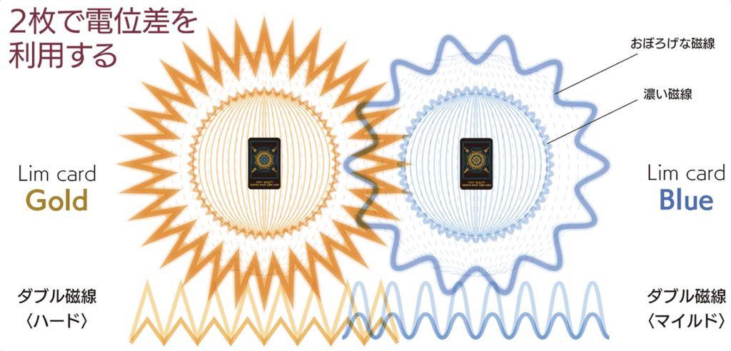 Lim cardは特別な機器を必要とせずに、たった2枚のカードだけで全ての物質の分子、原子の電気的な信号を、正確、緻密に転写加工することを可能にしただけではなく、電位差もつけることができる究極のカードです。